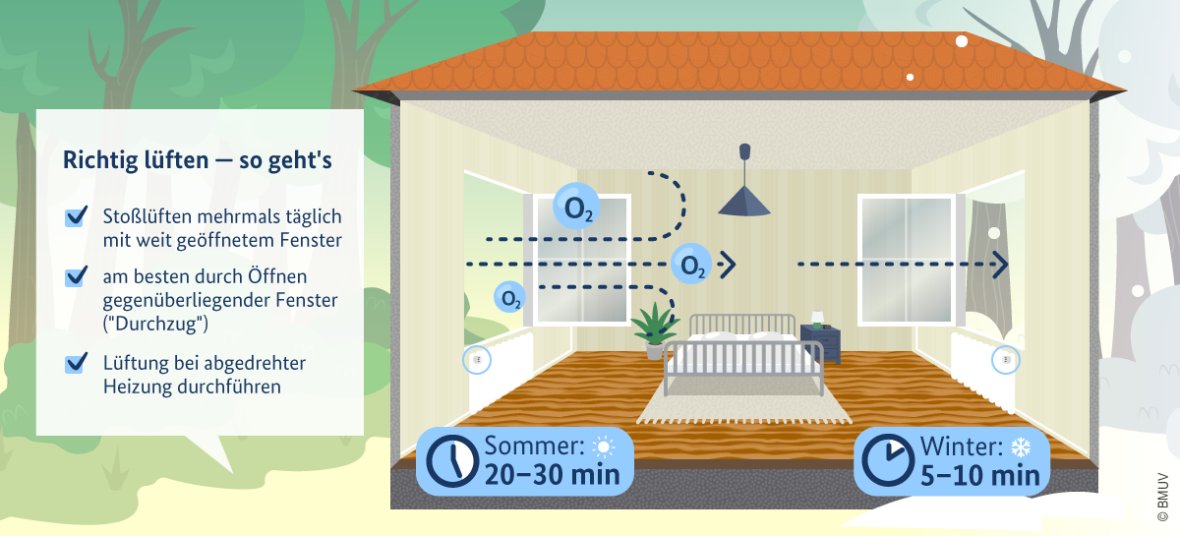 Richtiges Lüften ist ein wichtiger Beitrag zum Klimaschutz, da es hilft, Energie zu sparen. Gleichzeitig wird Schimmelbildung vermieden. Stoßlüften sorgt für einen schnellen Luftaustausch, ohne die Wände auskühlen zu lassen. Dadurch wird weniger Energie für das Wiederaufheizen benötigt, was Heizkosten und CO₂-Emissionen reduziert.